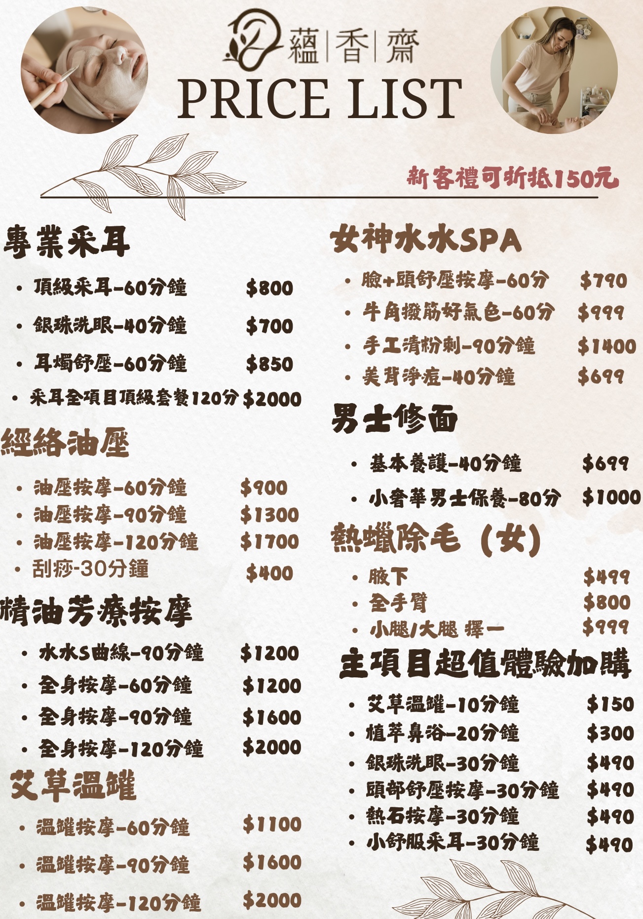 蘊香齋選用進口高品質純植物精油,現場手工調配,溫和安全。融合中式手法、西方芳香精油,量身打造專屬課程,搭配艾草溫罐、采耳、耳燭及美容等,提供全方位放鬆。獨立包廂一對一服務,重視隱私與氛圍細節,讓身心在課程中獲得深層修復與平衡。